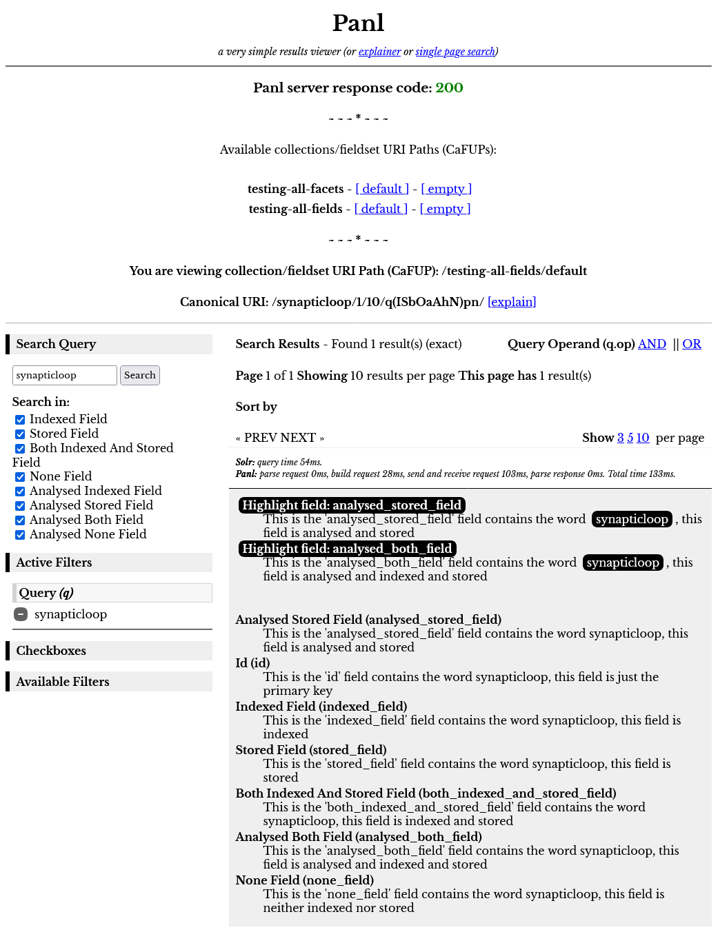 For the above examples with the version 1.7 schema without the above changes, for the all fields Panl collection with a specific search for 'synapticloop' with the URL: